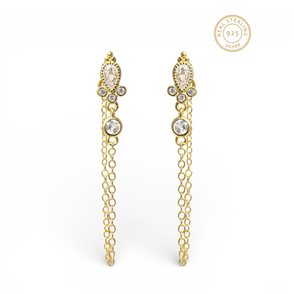 Crafted from pure silver (925) and feature a premium 18kt gold plating. Their dangle design enhances movement and light reflection, offering a sophisticated aesthetic. This combination of materials ensures durability and a timeless elegance, making them a versatile addition to any jewelry collection.
